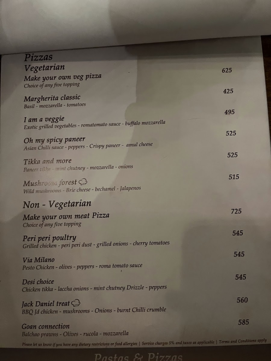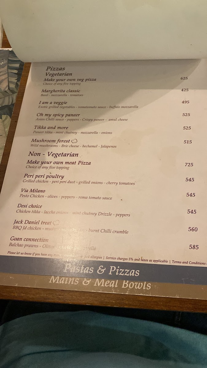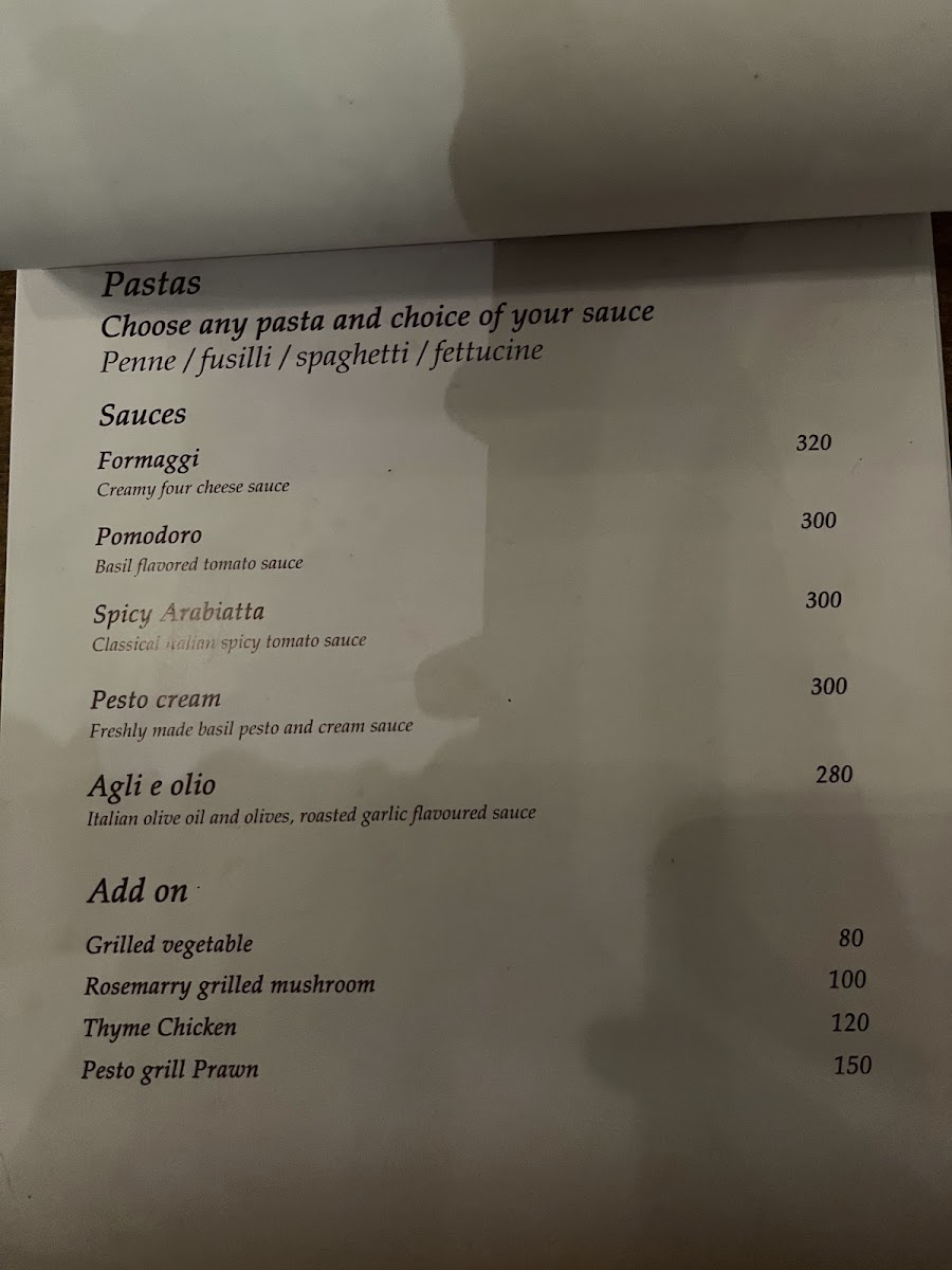 The menu is structured to include multiple categories such as appetizers, main courses, desserts, and drinks. Food offerings highlight both vegetarian and non-vegetarian items with options like pastas, rice dishes, and Korean and Japanese specialties. Notable examples include Pesto Pasta, Korean Ramyeon, Singapore Laksa Prawn, Korean Fried Chicken, and Crystal Dumplings available steamed or fried.