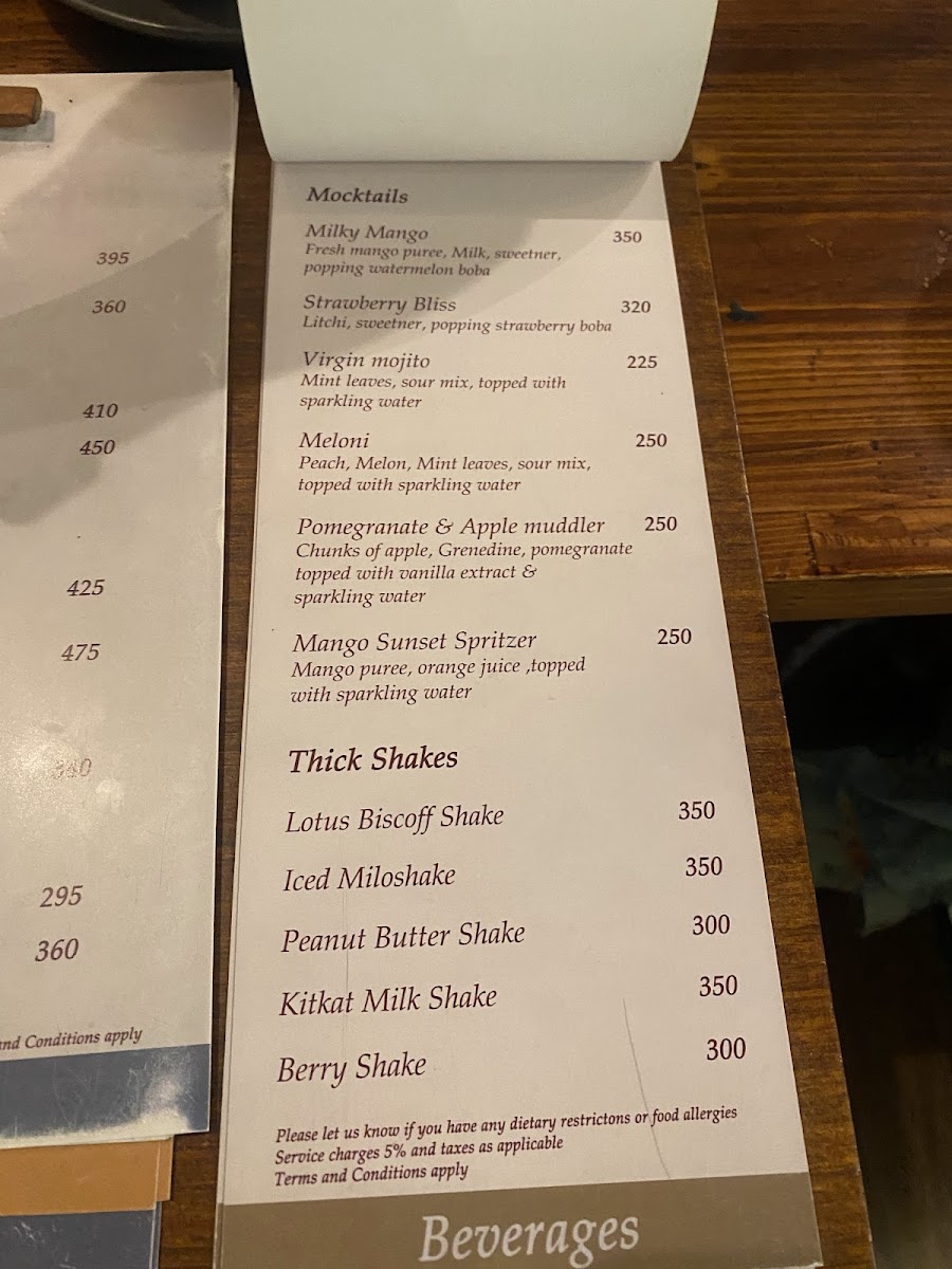Desserts include a variety of cakes and sweet treats such as Basque Cheesecake and Chocolate Cake. For beverages, the menu offers coffee selections like Affogato alongside a range of mocktails and specialty drinks including the Virjin Mojito.